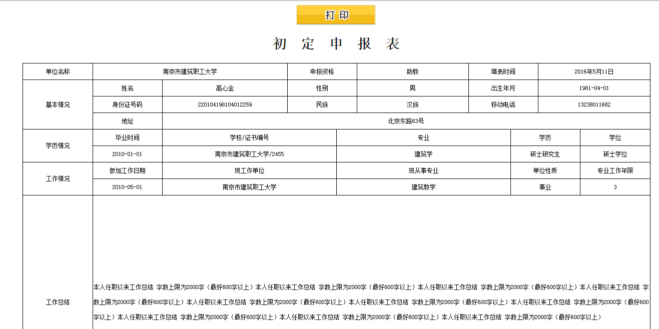 職稱初定申報(bào)信息經(jīng)審核通過(guò)后,申報(bào)人員可打印“職稱初定申報(bào)表”,點(diǎn)擊【打印申報(bào)表】進(jìn)行打印,如圖1.1.3.1、1.1.3.2所示。