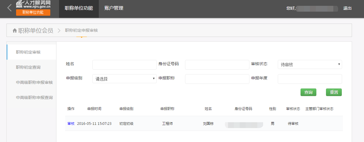 在“職稱(chēng)初定審核”模塊,可見(jiàn)本單位申報(bào)人員信息,如圖2.1.2.1所示。