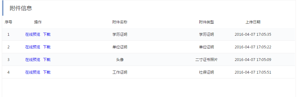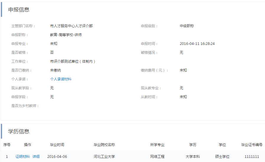 證明材料:點(diǎn)擊頁(yè)面上【證明材料】按鈕,可查看相關(guān)信息的證明材料,以教育經(jīng)歷為例,如下圖2.1.2.5所示。