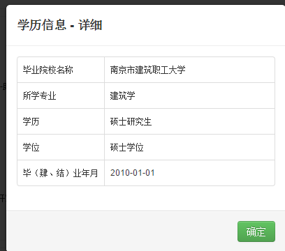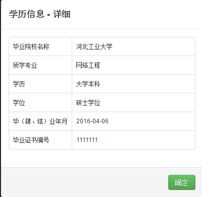 點(diǎn)擊【詳細(xì)】按鈕,彈出教育經(jīng)歷詳細(xì)頁(yè)面,如圖2.1.2.8所示。點(diǎn)擊【確定】,可關(guān)閉該彈出頁(yè)面。