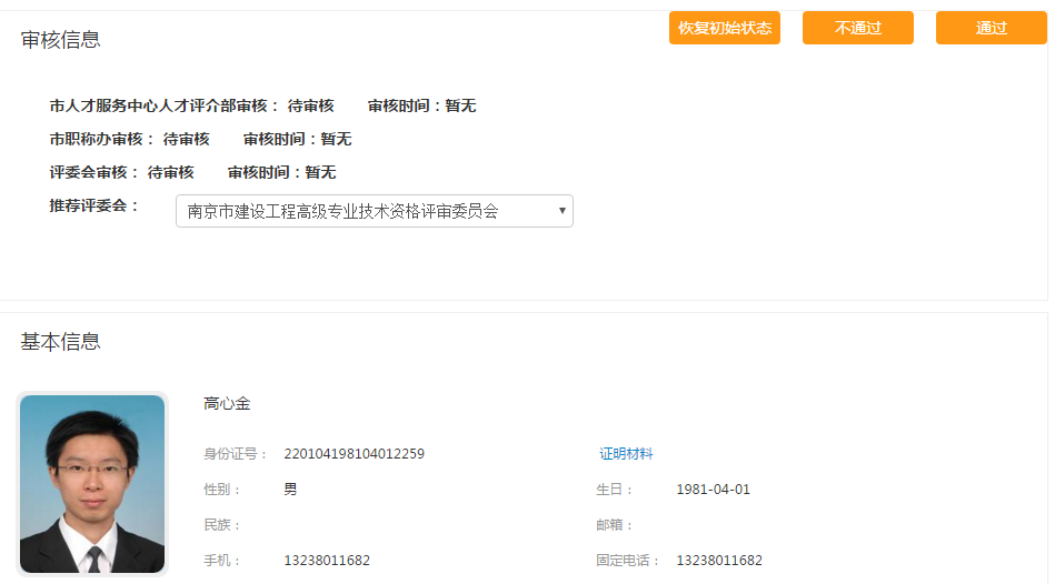 點(diǎn)擊【審核】,彈出審核頁(yè)面,查看申報(bào)人員信息,進(jìn)行審核,如圖2.2.2.2至2.2.2.5所示。