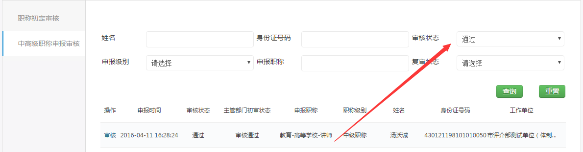 (1)將查詢(xún)條件中的審核狀態(tài)置為“通過(guò)”,點(diǎn)擊【查詢(xún)】按鈕,如下圖 2.2.2.10所示。